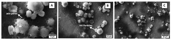 Figure 2A–C shows the SEM images of the zein/HA coatings (obtained via EPD, with electric field of 15 V applied for 3 min by keeping the concentration of HA at 5 g/L) at different magnifications. The characteristic structure of zein, i.e., a homogenous porous film, was observed. Similar results have been reported for the zein based coatings obtained via EPD []. The HA particles are integrated and dispersed fairly homogeneously into the pores of the zein matrix. The pores are partially blocked by the incorporation of agglomerated HA, which improves the mechanical stability of the film.