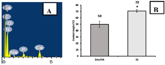 (A) EDX Spectrum; (B) Contact Angle comparison with a stainless steel substrate of zein/ HA coatings obtained via EPD (parameters: 5 g/L HA in the suspension, 3 min, 15 V) (* significant at p < 0.05). The data represents the mean ± standard deviation of five experiments for each system.