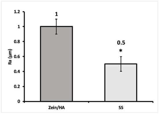Ra value comparison of zein/HA coating and bare SS with a mean ± standard deviation for five samples of each system (* marks the statistically significant difference p < 0.05).