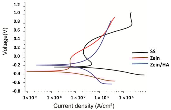 Polarization curves in DMEM at 37 °C for bare SS, zein and zein/HA coatings.