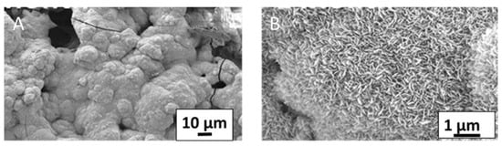 SEM images of zein/HA coatings after treatment in SBF for 3 days. (A) Low magnification and (B) higher magnification.