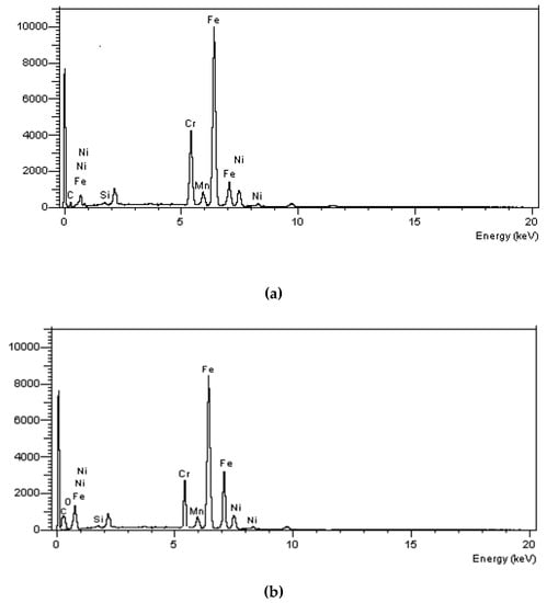 Scanning electron microscopy-energy dispersive X-ray spectrometry (SEM-EDS) analysis of the stainless-steel fiber (a) without the acid treatment and (b) after acid treatemnt.