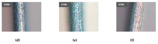 Photographs (700 X) of the stainless-steel fiber (a) without the acid treatment and after (b) 10 min, (c) 30 min, (d) 50 min, (e) 70 min and (f) 90 min of the acid treatment.
