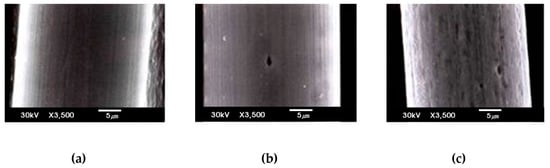 SEM micrographs (3500 X) of the stainless-steel fibers (a) without the acid treatment and after (b) 20 min and (c) 60 min of the acid treatment.