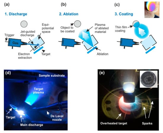 (a–c) Schematic sketch of the three main steps of ionized jet deposition (IJD) for thin film growth; (d) Photograph of the IJD chamber illustrating main discharge and target plasma during deposition with optimized operating parameters (discharge frequency f = 150 Hz, acceleration voltage V = 15 kV); (e) Photograph showing target overheating and formation of sparks during deposition with f > 250 Hz and/or V > 18 kV; the inlet displays a top view of the target’s surface after deposition with V = 18 kV.