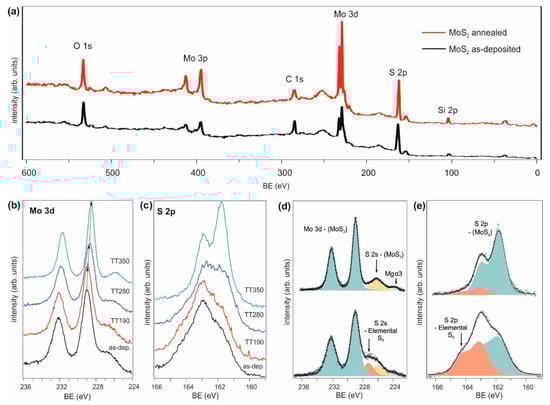 We performed different post-deposition thermal treatments (T = 190–350 °C) of the sample deposited at 15 kV acceleration voltage for 60 min. Chemical analysis of the as-deposited sample as well as after each annealing step was conducted by in-situ XPS to investigate the composition/stoichiometry of the thin films and the influence of annealing temperature, as shown in Figure 2. The XPS wide range spectra of as-deposited and annealed thin film are reported in Figure 2a and confirm the presence of molybdenum (Mo) and sulfur (S), as well as silicon (Si) and SiO2 (due to the substrate) with its oxygen counterpart, and carbon related to contaminations during the growth process and/or after air exposure.