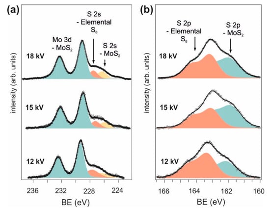 The Mo 3d core level spectra in Figure 3a exhibit similar line shapes for all three as-deposited samples, whereas the S 2s component (yellow) at around 226 eV is slightly smaller in the sample deposited at 12 kV. In Figure 3b, the S 2p component (red) corresponding to elemental sulfur reaches a minimum for the sample deposited at 15 kV. This is also supported by the estimated S/Mo ratio (considering both S species, see Table 2), which is the smallest (highest) for the sample deposited at 15 kV (12 kV). The difference of Mo 3d5/2 and S 2p3/2 binding energies of all three as-deposited samples is in the order of the 2H-MoS2 value of 67.19 eV, with a slightly reduced energy difference for the as-deposited thin film at 12 kV (67.01 eV). In case of the as-deposited thin film at 18 kV, the energy difference between the two core levels is 67.15 eV, thus typical of MoS2, and the S/Mo ratio is again higher than the one for the as-deposited thin film at 15 kV.