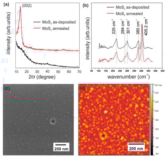 The SEM image of the annealed MoS2 thin film is displayed in Figure 4c and shows a homogenous and continuous surface morphology with bright spots (sizes of 50–100 nm) visible all over the surface. A similar surface morphology is observed in the AFM image in Figure 4d, where the spots can be seen more clearly. The surface roughness (root-mean-square, RMS) of the thin film was found to be RMS = 1.28 nm over an area of 5 × 5 µm2.