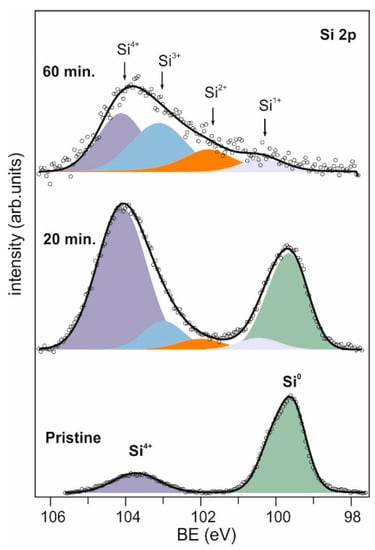To investigate possible interactions of the target plasma with the substrate, the interface between as-deposited MoS2 and SiO2/Si substrate was carefully investigated via XPS. For this purpose, samples were deposited at 12 kV using two different deposition times (20 and 60 min), and annealed at 400 °C. The substrate-related Si 2p core level spectra of the two samples were compared to the spectrum of the pristine SiO2/Si substrate (see Figure 5).