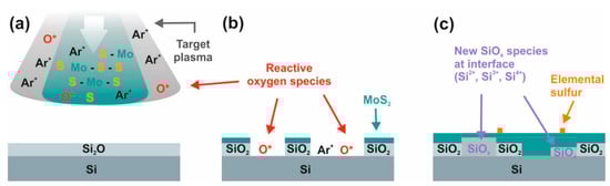 Schematic illustration of interfacial reactions in case of IJD-MoS2 on SiO2/Si substrate: (a) before ionized jet deposition; (b) initial etching of the SiO2 native oxide; (c) formation of complex SiOx surface and MoS2 thin film growth.