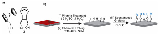 Sulfuric acid (Puranal TM, 95–97%), hydrogen peroxide (30 wt.% in water), ammonium fluoride (Puranal TM, 40 wt.% in water) and ferrocene methanol (97%) were purchased from Sigma Aldrich (New South Wales, Australia) and used without any further purification. The synthesis of norbornylogous bridge (NB) 2 has been reported elsewhere [37]. Dichloromethane (DCM), isopropyl alcohol (IP) and ethanol were purified by distillation before use. Silicon wafers were purchased from Siltronix, S.A.S. (Archamps, France). The p-type silicon was highly doped (boron), with nominal resistivity between 0.007 and 0.013 Ω cm and wafer thickness of 500 ± 25 µm. Wafers were oriented ±0.5° away from the (111) plane. Milli-Q water (>18 MΩ cm) was used for all cleaning procedures and to prepare electrolytic solutions.
