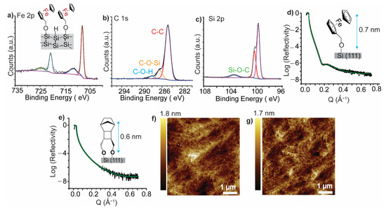 Surface characterization of the formed monolayers. (a–c) High resolution X-ray photoelectron spectroscopy (XPS) spectra for Fe 2p (a), C 1s (b) and Si 2p spectrum(c) for a monolayer of 1 on Si–H, suggesting covalent bond formation by Si–O–C contacts as demonstrated in the Si 2p and C 1s fittings. (d,e) X-ray reflectometry (XRR) measurements for the monolayer of 1 (d) and 2 (e) on Si–H. Black line is raw data and green line represents the best fit. XRR fitting parameters are shown in supporting information (Table S1). (f,g) Atomic force microscopy (AFM) topography images for Si (111)–H surface functionalized with 1 (f) and with 2 (g).