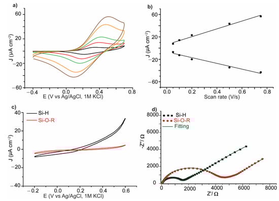 Electrochemical characterization of the formed self-assembled monolayers (SAMs). (a) Cyclic voltammograms at different scan rates for a SAM of 1 on Si–H, black: 0.05 Vs−1, red: 0.1 Vs−1, green: 0.2 Vs−1, orange: 0.5 Vs−1, brown: 0.75 Vs−1. (b) Evolution of the peak current vs scan rates, dots are data points and lines are linear fitting. (c) Cyclic voltammetry (CV) wave for the formed SAM of 2 on Si–H (red) as compared to a bare Si–H electrode in NaClO4 (1.0 M) electrolyte, showing that the bare Si is more prone to oxidation than the monolayer-protected surface. (d) Nyquist plot of the electrochemical impedance spectroscopy (EIS). measurement for a SAM of 2 on Si–H, measured in a solution of ruthenium hexamine (10 mM) in 0.5 M KCl. Dots (red and black) represent the raw data and green line represents the Randles circuit fitting. Rct for Si–H ~ 1187 Ω and for Si–O–R surface ~4571 Ω.