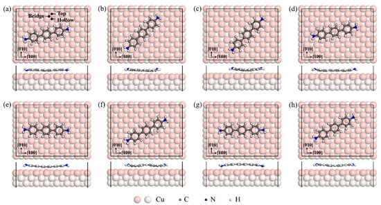 In order to find the most stable adsorption configuration of a DAT molecule on the Cu(001) surface, the center of the DAT molecule is initially located on different adsorption sites with different rotation angles. The typical adsorption sites are considered, namely, top, hollow, and bridge sites, as shown in Figure 1a. The initial rotation angle of a DAT molecule relative to the [100] direction is also considered as 0°, 15°, 30°, or 45°, respectively. In each case, a freestanding DAT molecule is set with an initial vertical distance of 3.00 Å from the Cu surface. The adsorption energy of a DAT molecule on a Cu(001) surface is estimated using the following equation:
