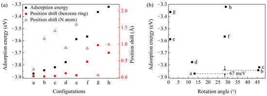 The adsorption energies of configurations a to h. (a) The adsorption energies and the position shifts between the DAT molecule and the Cu(001) surface. The black square is the adsorption energy. The red circle and the red triangle represent the smallest position shift between the center of a benzene ring and hollow sites, and that between a N atom and top sites, respectively. (b) The adsorption energies distribution at different rotation angles ranging from 0° to 45°. The detailed structural configurations of a to h are given in Figure 1.