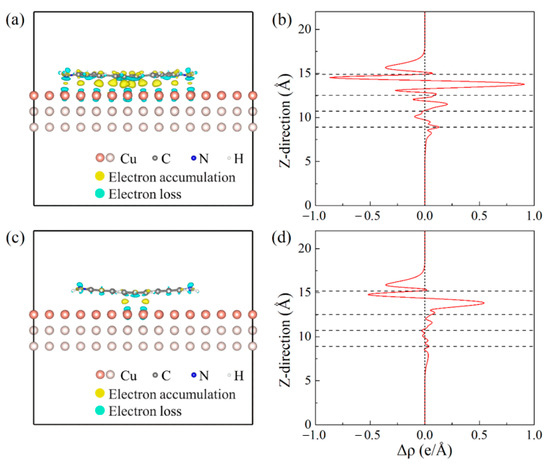 Adsorption of the DAT molecule on the Cu(001) surface should induce an electron redistribution due to the interaction between the molecule and the substrate [25,26,27,28,29,30,31,32,33]. To quantitatively understand the adsorption behavior in the DAT/Cu(001) system, the electron density difference (EDD) has been calculated with the following equation: