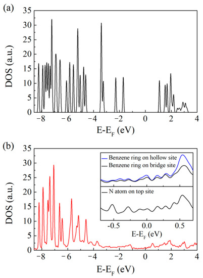 Molecule–metal hybrid systems have attracted much attention in modern surface science and technology for their potential applications in heterogeneous catalysis, molecular electronics, photovoltaics, and light-emitting diodes [1,2,3,4,5,6,7,8]. The hybrid systems are very sensitive to the adsorption configuration, the stability of the molecules on surfaces, and the physical or chemical interactions between the molecules and the substrate. Hence, it is key to figure out the adsorption behavior in order to design novel nanodevices at the single-molecule scale. However, the precise chemical structure and orientation of 3D twisted/bending molecules on a surface are difficult to be visualized by using standard experimental techniques, such as atomic force microscopy and scanning tunneling microscopy [9,10]. First principles calculations based on density functional theory are playing an increasingly important role in describing molecule–metal hybrid systems—not only the adsorption configurations and the interactions between molecules and surfaces, but also potential reaction pathways [6,11,12].