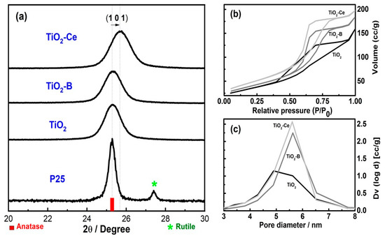 (a) The (101) pXRD of sol-gel synthesized samples (TiO2, TiO2-B, and TiO2-Ce). P25 is the reference. (b) BET analysis for nitrogen adsorption-desorption, and (c) pore diameter distribution.
