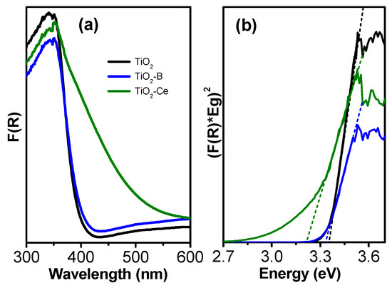 Optical Absorption Analysis—The Kubelka–Munk function deduced from the diffuse reflectance spectroscopy (DRS), is shown in Figure 2a. Tauc’s analysis, Figure 2b, data from Figure 2a, provides the band gap energy, Eg [43,44]. In agreement with the literature, Eg (TiO2 Anatase) was 3.35 eV [36,45]. The TiO2-B sample shows a slight absorption in the visible region, whereas the TiO2-Ce sample presented an extended threshold in the same region. Eg for TiO2-B and TiO2-Ce are 3.30 and 3.2 eV, respectively [46,47]. The absorption threshold in the visible region assesses that boron and cerium species in the titanium dioxide lattice modify the optoelectronic properties of TiO2, Table 1.