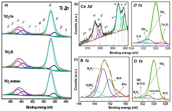 High-resolution XPS spectra (a) Deconvoluted Ti 2p spectra: TiO2 anatase, TiO2-B, and TiO2-Ce samples. (b) Ce 3d with O 1s, and (c) B 1s regions including the O 1s spectra.