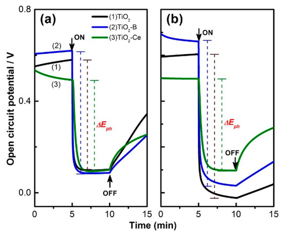 The driving force of the system is displayed by the magnitude of the electrode potential, under illumination, ΔEph. This parameter was measured in H2SO4, and H2SO4 + 0.5 M CH3OH. Methanol is usually used as a hole scavenger, and/or sacrificial agent in photocatalytic processes. In the experiment shown herein, in 0.5 M H2SO4, the magnitude of the photo-potential, ΔEph, on TiO2-B is higher than that of TiO2 and TiO2-Ce. This trend is maintained in the presence of methanol, Table 3. It can be seen, however, that the initial OCP in darkness gives accounts on the electrolyte species interaction at the semiconducting electrode’s surface, Figure 4a,b. The information obtained herein, via these simple experiments, titrate the ability of these non-modified, and modified semiconducting oxide to act as photocatalysts and/or photo-electrocatalysts.