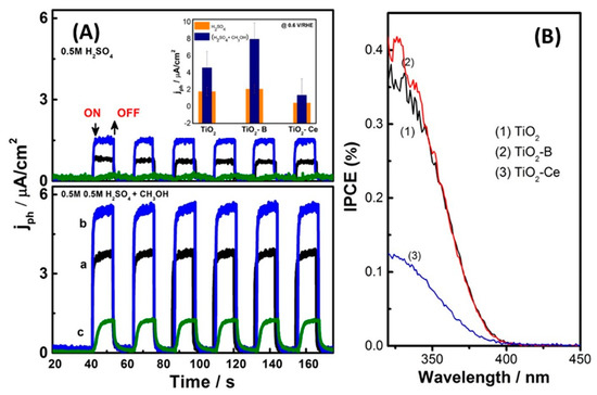 (A) Photocurrent response under chopped light (0.1 Hz) at 0.6 V/RHE on TiO2 (a), TiO2-B (b), and TiO2-Ce (c). Inset: Final ratio analysis in acid (orange) and acid + methanol (navy blue) reaction. (B) IPCE (incident photon to current efficiency) analysis obtained in acid + methanol, see data in Table 3. Mass deposited: 0.2 mg/cm2.