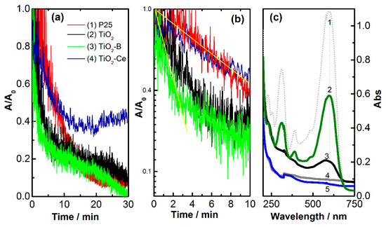 (a) Photo-discoloration of RB5 (Reactive Black 5) under UV-Vis light, (b) log (A/A0) vs. t, and (c) UV-Vis Reactive Black 5 (RB5) azo dye spectra, ti = 0 min curve (1); titrated at t = 30 min, (curves 2–5). TiO2 anatase (3) TiO2-B (5) and TiO2-Ce (2). P25 is a reference sample (4).