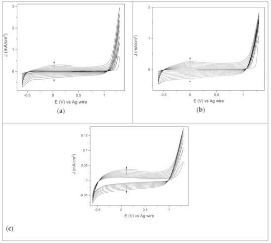 Indicating the continuous growth of the PEDOT film on the substrate. Furthermore, deposition after deposition, the current density range of the CVs widened, with an increase of both cathodic and anodic current. This capacitive effect arose from the continuous growth of the electroactive polymeric film on the electrode, with a thickness that increased scan after scan [35].