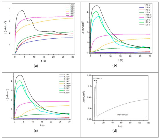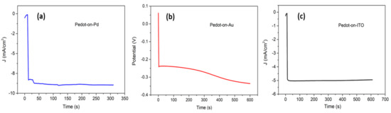 Figure 2 shows the current density–time plots for the potentiostastic electropolymerization of PEDOT on Au, Pt and ITO. On gold, the depositions performed between 1.15 V and 1.22 V (Figure 2a) were characterized by a similar trend, which could be divided into two different regions. The general features of these curves were similar to those reported in the literature [40,41,42,43,44,45].