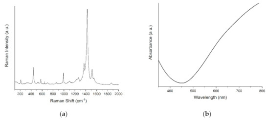The morphology appeared rough and dense, with highly visible cluster sites and uniform particle sizes (Figure 3, Figures S1 and S2). The difference between the two metallic substrates (Figure 3a,b) was negligible. On the contrary, the PEDOT films on ITO evidenced a more indented pattern, suggesting a greater contribution from nucleation. This effect can be related to the ITO surface’s higher roughness, with respect to the metal ones. The Raman spectra confirmed the presence of PEDOT in all the samples. As seen from Figure 4a, the bands at 440 cm−1, 992 cm−1 and the broadband at 1240–1270 cm−1 were assigned to the C–O–C deformation, oxyethylene ring deformation and Cα–Cα inter-ring stretching, respectively. In particular, the peculiar band at 1427 cm−1 due to symmetric Cα=Cβ (–O) stretching indicated a high level of conjugation in the structure of PEDOT [46,47,48]. The visible spectrum of the PEDOT coating on ITO (Figure 4b) showed the characteristic broadband dip in the absorption signal at approximately 400–700 nm, which may be related to the π–π* transitions of thiophene ring [48].