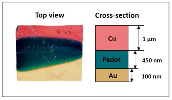 The Cu2+ ions were reduced by an electrochemical one-step process on the polymer coated substrates in an acidic electrolyte solution (1.5 M H2SO4 and 0.5 M CuSO4, pH ranging between 1 and 1.5). Potentiostatic and galvanostatic methods were both investigated, exploring different parameters combinations, in order to obtain a uniform layer of copper with a thickness between 1 and 4 µm [49,50]. In particular, the copper depositions on PEDOT/Pd, PEDOT/Au and PEDOT/ITO were performed at −0.8 V for 300 s, −0.007 A for 600 s and −0.9 V for 600 s, respectively. Figure 5 shows the copper deposition curves on the different samples. An example of a produced sample, including the schematic representation of the layers, is reported in Figure 6.