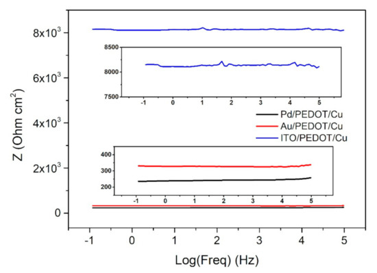 Figure 7. Bode plot of the PEDOT/Cu device, obtained on the three different substrates (Pd in black, Au in red, ITO in blue). Areas of interest are magnified in the two insets, which help in visualizing the Z values.