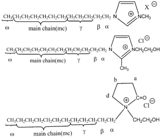 The structures of 1-alkyl-3-methylimidazolium, 1-alkyl-3-hydroxyethyl-2-methylimidazolium and N-dodecyl-N-hydroxyethylpyrrolidinonium ILs, respectively. Adapted from [18].