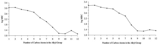 Rzemieniecki et al. [29] synthesized 1-alkyl-4-hydroxy-1-methylpiperidinium ILs combined with mandelic acid (S, R enantiomers or racemic) as well as with an elongating alkyl chain, resulting in salts with a heterocyclic cation with cis and trans isomeric forms. They already reported that the increasing of the alky chain resulted in a linear increase in surface activity parameters, pC20, as well as the antimicrobial activity against a series of Gram-positive and Gram-negative bacteria (see Figure 8). They also indicated no significant influence related to chiral form of the anion, but a strong correlation between antimicrobial activity and the amphiphilicity of the ionic liquid.