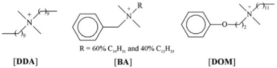 Structures of the cations including didecyldimethylammonium DDA, benzalkonium BA, and domiphen [N,N-dimethyl-N-(2-phenoxyethyl)-1-dodecanaminium] [DOM]. Adapted from [21].