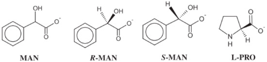 Structures of the anions including racemic mandelate [MAN], R-mandelate [R-MAN], L-mandelate[L-MAN], and L-proline [L-PRO]. Adapted from [21].