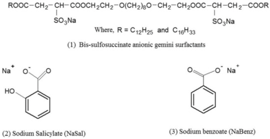 Molecular structures of (1) bis-sulfosuccinate anionic gemini surfactants, (2) sodium salicylate (NaSal), and (3) sodium benzoate (NaBenz). Adapted from [25].