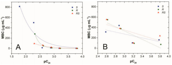 Relationships between adsorption efficiency (pC20) and mean values of MBC towards Gram-positive bacteria (A), Gram-negative bacteria (B) with (S)-mandelate, (R)-mandelate, and (RS)-mandelate anions [29].
