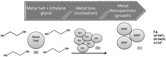 Chapman et al. [34] addressed the biofouling distress by adapting various period-four metals as the active components to dope sol-gel (SG) coatings with antibacterial activity. The metallic nanoparticles (MNPs) were obtained through a poly-ol reduction method, which involves the use of a reducing reagent (in this case the agent used was NaBH4) in a solution of ethane-1,2-diol, as can be observed in Figure 9. To that solution, metal salts are added, which suffer reduction from the medium and engage in nanoparticle formation. The metals used in this studied were the chloride salts of Scandium (III), Titanium (III), Vanadium (II), Manganese (II), Iron (III), Cobalt (II), Nickel (II), Copper (II), Zinc (II), Germanium (II), Selenium (IV), and the nitrate salts of Chromium (III) and Gallium (III), which gave rise to the corresponding metal nanoparticles, all below 90 nm of diameter.