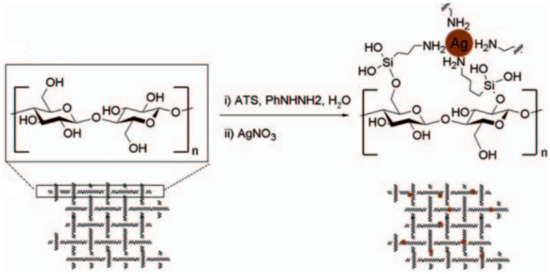 Liu et al. [37] prepared a set of silver-nanoparticles for application on textile fabrics. The novelty of this work lies in a one-pot and in situ method to directly assemble the nanoparticles in the cotton fibers by their surface modification with 3-aminopropyltriethoxysilane. This modification converts the terminal positions of the cotton polysaccharides in amine groups, which can adsorb the silver ions and slowly release it upon contact with bacteria, as can be seen in Figure 10. By this way, the leaching of silver ions into water effluents is overcome. The antibacterial tests were satisfactory, as more than 99% of the bacteria growth ceased within one hour of contact with the material. Additionally, the textiles have also demonstrated continued anti-bacterial efficiency after several cycles of washing, which might help establish this method for the application in the continuous disinfection of textile fabrics in industrial proportions.