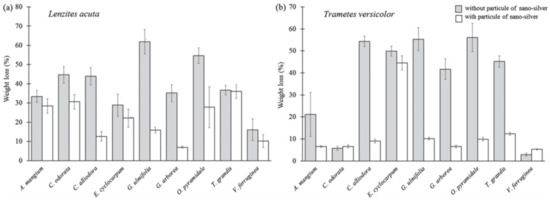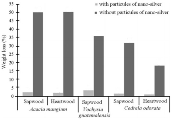 Moya et al. [40] studied the effect of treating tropical wood with silver nanoparticles and the subsequent effect on the white-rot decay disease, caused by a fungus. The silver nanoparticles were synthetized in a simple manner by adding AgNO3 to a solution of NaBH4 and PVP as a stabilizer. The obtained nanoparticles were then inserted, through a pressure device, in fine plaques of three different types of tropical woods native from the Costa Rica flora (Acacia mangium, Cedrela odorata, and Vochysia guatemalensis). The effectiveness of silver nanoparticles in these species was measured by the degradation of wood against fungal attack, specifically resistance to white decay disease caused by Trametes versicolor. In every case, the addition of silver nanoparticles in the wood proved efficient in preventing the action of the fungal decay. When silver nanoparticles were added, weight loss in the wood samples was less than 5% for both heartwood and sapwood of the three species, as can be observed in Figure 11. These results confirm that the effect was caused by the application of silver nanoparticles as a wood preservative and can lay the ground for the use of such silver nanoparticles in the prevention and conservation of wood. A broader study on the same subject was conducted by the same research team in 2017 [41]. Silver nanoparticles were synthetized in a similar fashion, though in this study, polyethylene glycol was used in excess as the reducing agent. The obtained set of nanoparticles was pressed in wood, using the same protocol already described, though this time, a bigger set of tropical woods was used to broaden the study of silver nanoparticles in the prevention of the white-ort fungal disease. The authors found that different plant species tend to have different retention capacities for the nanoparticle materials, which can be related to the number of nanoparticles absorbed by the wood and the potency of the antibiotic effect. Nonetheless, all the tested trees improved their stability, durability, and resistance to the white-rot fungus T. Versicolor, as it is shown in Figure 12b. However, the silver nanoparticles could not produce any significant effect on the resistance of the brown-rot fungal disease caused by L. Acuta, showcased in Figure 12a.