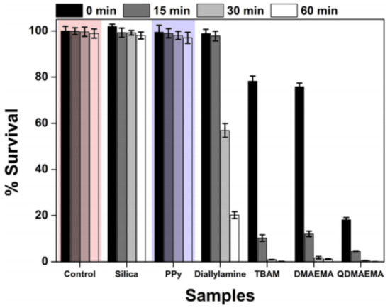 In 2016, Lee et al. [44] studied the effect of coating the surface of silica nanoparticles with different amine-based polymer molecules. The selected molecules in this study were based on amine functionalities, and were polypyrrole (Ppy), diallylamine, 2-(tert-butylamino)ethylmethacrylate (TBAM), and dimethylaminoethyl methacrylate (DMAEMA), which were then coupled to the surface of the nanoparticles through vapor deposition method (VDP). Then, the products were treated with 1-bromohexane to promote the quaternization of the amines. Because it is well established that quaternary ammonium salts are very effective antibacterial agents, the authors used that knowledge to shield the material with antibacterial properties. However, despite its charge, Ppy is not a quaternary ammonium salt and thus it would be expected to behave differently from the remaining materials. In fact, Ppy was not able to produce any considerable effect on the bacteria, which proves the statement postulated by the authors that under moist conditions, the amino group of PPy was not protonated, resulting in an absence of biocidal performance. As for the other nanoparticles, they were all able to kill bacteria within the time scope of one hour, despite all of them having different attacking profiles and different efficiencies, as can be observed in Figure 13.