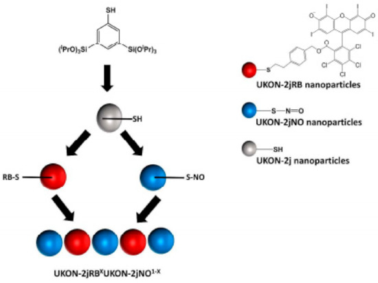Gehring et al. [45] designed a system based on mesoporous organosilica (PMOs) nanoparticles that simultaneous releases nitric oxide (NO) in combination with singlet oxygen and superoxide radicals (O2⦁−), as reactive oxygen species (ROS), with significantly enhanced biocidal activity. The pristine nanoparticles were obtained by adapting a Stöber protocol for the synthesis of thiol functionalized PMOs NPs. The synthesis was achieved following a two-step reaction, using 1,5-bis-tri(isopropoxysilyl)-benzene-3-thiol (PrOi)3Si)2PhSH) as SH precursor and CTAB and Brij-56 as surfactants. NPs were posteriorly modified via S-nitrosothiol groups by reaction of the thiol groups with NaNO2, and the ROS-producing photosensitizer Rose Bengal was attached via thiol-ene-click-chemistry (Figure 14). To test the antibacterial effect, the material was irradiated with visible light and assessed for the ability to interfere with bacterial colonies. It was found that the results show a high bactericidal activity and complete destruction of colonies and thus the way is open for the incorporation of this technology in the disinfection control of medical applications, or for other uses, as there exists a huge versatility of possible interactions between the thiol groups and materials such as cotton fibers.