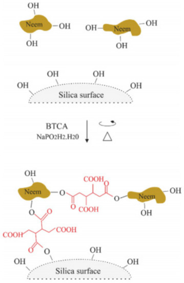 Representation of the method employed for the synthesis of cross-linked Neem Bark Extracts in silica surface with BTCA. Retrieved from [47].