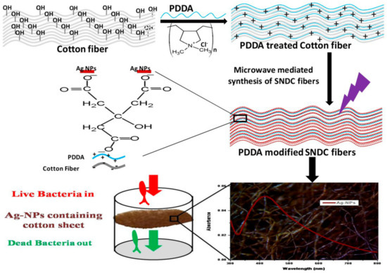 In 2017, Bhardwaj et al. [49] designed a novel way to incorporate silver nanoparticles (SNPs) directly onto cotton fibers through a microwave-assisted protocol. Pre-washed cotton fibers were submerged in a 2.5M aqueous solution of poly-(diallyldimethylammonium chloride) (PDDA) for 12 h and then were dried at room temperature. Following these step, the fibers get shielded with positive charges in their surface. The pre-treated fibers were then submerged in a 2M solution of sodium citrate with the subsequent addition of an aqueous silver nitrate solution and irradiated with microwave radiation. Under such conditions, SNPs are formed directly in the surface of the cotton fiber, coupled to the positive charges given by the PDDA reagent. The authors optimized the protocol by varying the irradiation time and the microwave power, to control the size of SNPs and total density of silver atoms. These parameters increase by increasing the microwave power from 100 W to 600 W. A full representation of the method, from starting materials to the antibacterial testing, is reported in Figure 16. The cotton fibers were tested to assess their antibacterial properties and revealed higher activity against Gram-negative bacteria, such as Salmonella typhimurium, than Gram-positive bacteria, such as Staphylococcus aureus. On the other hand, it was noted that an excellent deactivation of bacterial colonies happened with Escherichia Coli, which suggests the protocol can be effectively employed for the treatment of cotton fibers in decontamination purposes.