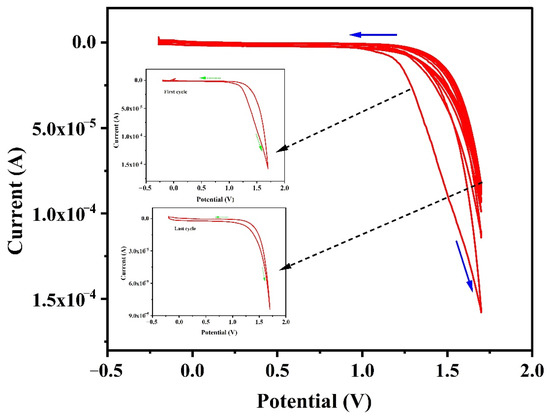 Figure 2 represents the CV cycles (10 cycles) for electro-polymerization of TY [49] on the surface of carbon paste electrode (CPE). Electro-polymerization is carried out in the potential range between −0.25 V and +1.75 V in 0.1 M PBS for 10 cycles at pH 7.0 containing 1 × 10−4 M TY solution. The 10 polymerization CV cycles afford the optimum peak current response with improved sensitivity for the redox reaction of CRC. So, 10 CV cycles are chosen as optimum for the polymerization of TY on the CPE. The resultant plot represents that the decrease in current with the increase in the number of CV cycles. This indicates the conversion of the monomer of TY into the polymer film of TY on the CPE surface.