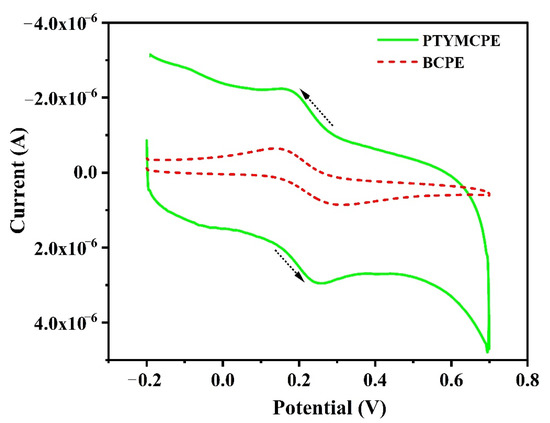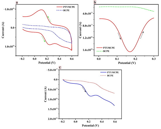 Figure 4b describes the responses of DPV for the electrochemical reaction of 1 × 10−5 M of CRC at PTYMCPE (solid line) and BCPE (dotted line). The peak potential (Ep) for the CRC oxidation at PTYMCPE was detected at 0.170 V with a peak current of 1.66 µA and the peak potential of CRC at the BCPE was at 0.163 V with a peak current of 0.18 µA. The peak current enhancement was observed at PTYMCPE. The CRC (1 × 10−5 M) behavior at PTYMCPE (solid line) and BCPE (dotted line) using LSV are illustrated in Figure 4c. It was observed from the response of the electrodes that the peak potential for the reaction of CRC at PTYMCPE was at 0.229 V with a peak current of 0.84 µA and that of BCPE was at 0.216 V with a peak current of 0.13 µA. Therefore, enhanced CRC detection was observed significantly at PTYMCPE. This shows that the polymer-modified electrode increases the electrochemical performance of the analyte considerably.