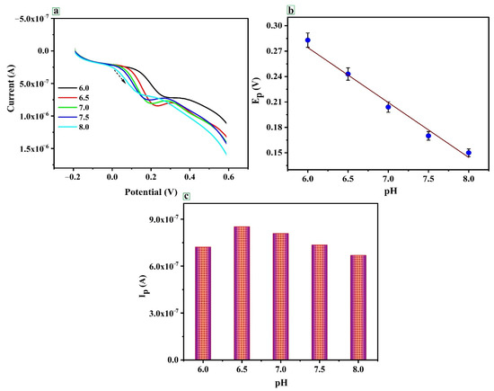 The electrochemical behavior of CRC in 0.1 M PBS is studied at different pH (5.5 to 8.0) at PTYMCPE surface through LSV (Figure 5a). It has been shown that the peak potential and electrocatalytic peak current depend on the pH of the solution. Additionally, it is evident from Figure 5b that the shift of the peak potential (Ep) towards the negative potential with the rise in pH may indicate that the protons are involved directly in CRC oxidation, obeying the following equation: Epa (V) = −0.0678 pH + 0.6846 (R = 0.993). Slope 0.067 (experimental) ≈ 0.059 (theoretical) shows the transfer of equal number of proton and electron in the reaction [50,51]. It is observed that the peak current of CRC reaches its highest value at pH 6.5 and then gradually decreases with an increase in pH (Figure 5c). Hence, pH 6.5 is considered the optimum pH for the determination of CRC. In addition to this, the anodic peak potential (Epa) of CRC at PTYMCPE shifts towards lower negative values with the increase in the pH of the buffer solution.