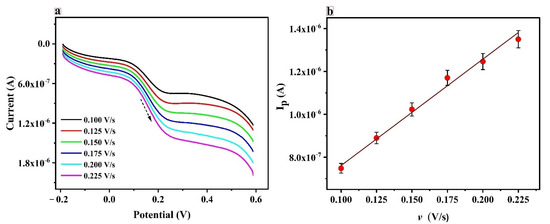 From Figure 7c, the peak current is varied with the increase in the scan rate. A linear relationship between the scan rate and the peak current is established, and a straight line is obtained with the linear regression equation Ipa (µA) = −4.899 + 69.3171 v (V/s), R = 0.999.