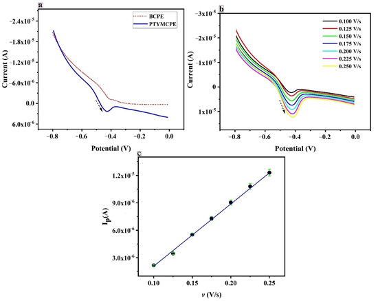 The scan rate influences the electrocatalytic oxidation of the CRC on the PTYMCPE were investigated by LSV; the results are shown in Figure 6. It illustrates the influence of scan rate on electrocatalytic oxidation of CRC on PTYMCPE. Figure 6a shows that the anodic peak current increases linearly with increasing scan rate in the range from 0.1 V/s to 0.225 V/s. In addition, the plot of anodic peak current (Ipa) against the scan rate is shown in Figure 6b. It is evident from the graph that the current varies linearly with the scan rate. The linear regression equation is Ipa (µA) = 0.264 + 4.96 v (V s−1) with a correlation coefficient of 0.99. This confirms that the electrochemical behavior of CRC at the modified electrode was adsorption-controlled.